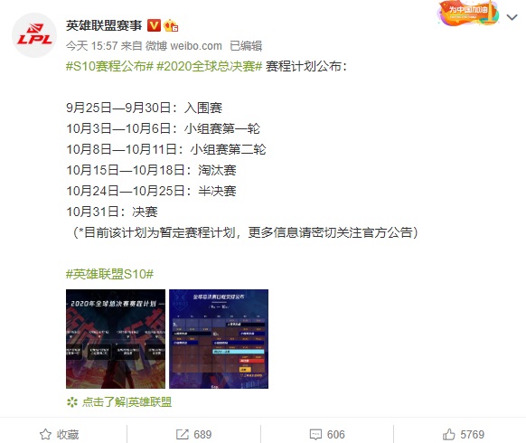 IT之家8月24日消息 @英雄联盟官方赛事 今日公开了 2020 全球总决赛赛程计划。本次 S10 总决赛入围赛阶段的比赛将从 9 月 25 日开始,总决赛将于 10 月 31 日举行。