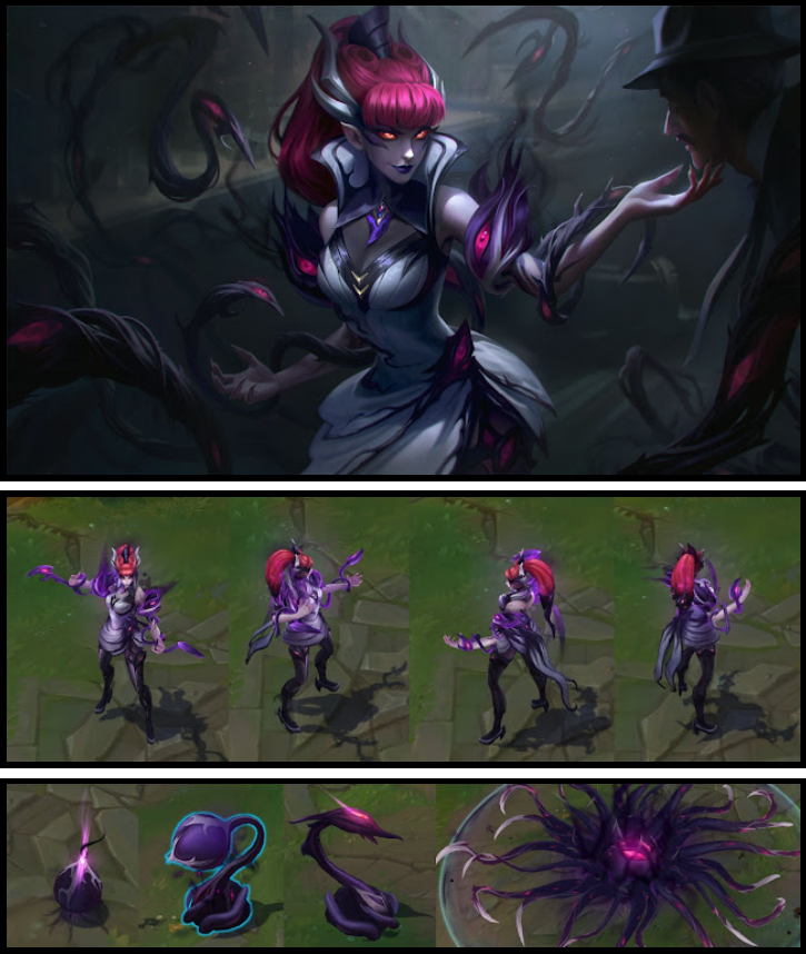 地下都市阿卡丽,这个系列在早前的概念作品中就有阿卡丽的皮肤曝光,从原画上就可以看出这个模型是比较简洁的,原画比较漂亮,阿卡丽自从重做之后出皮肤的速度很快,这几年已经接连出了好几款新皮肤了。