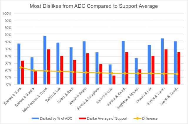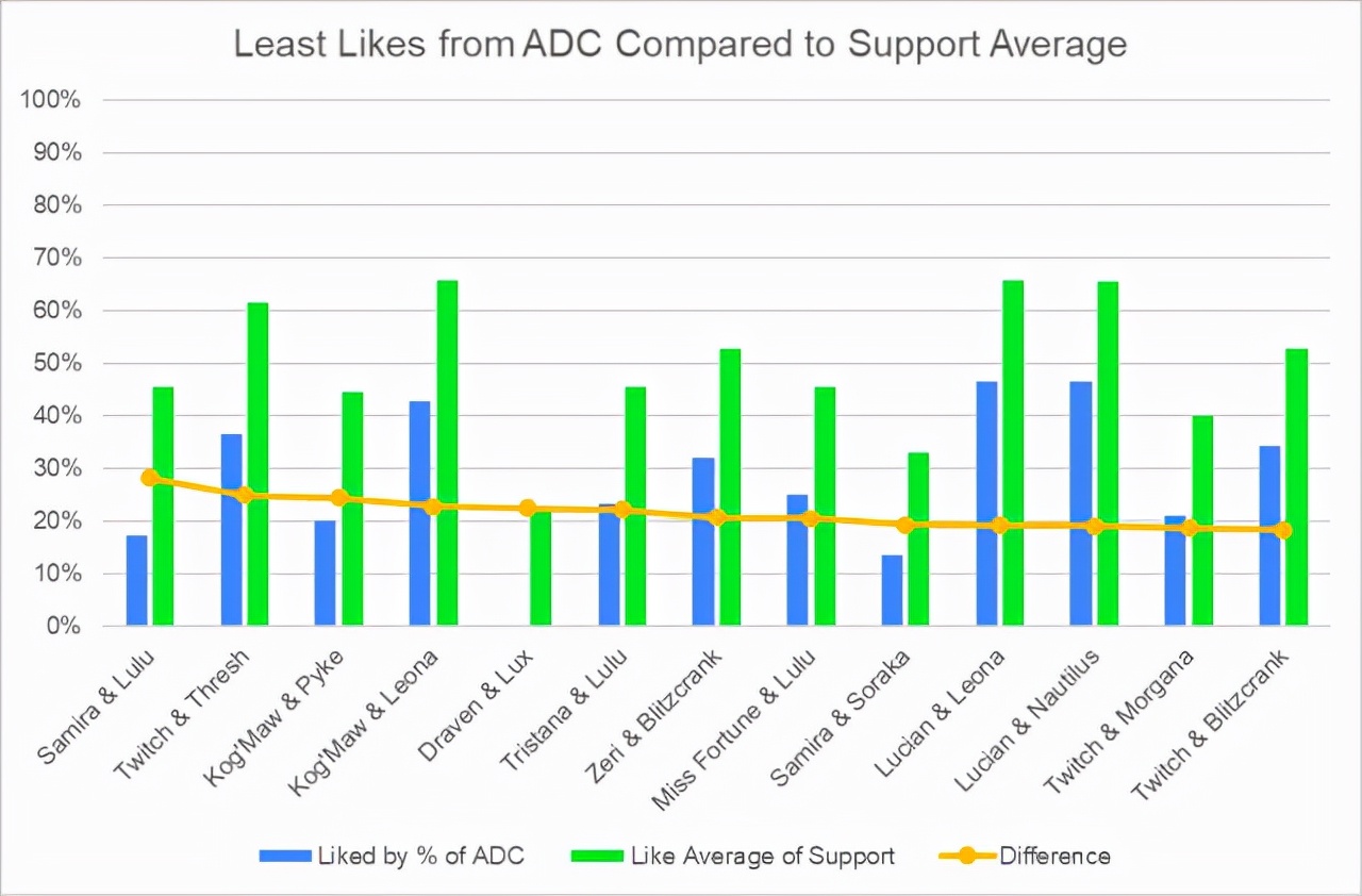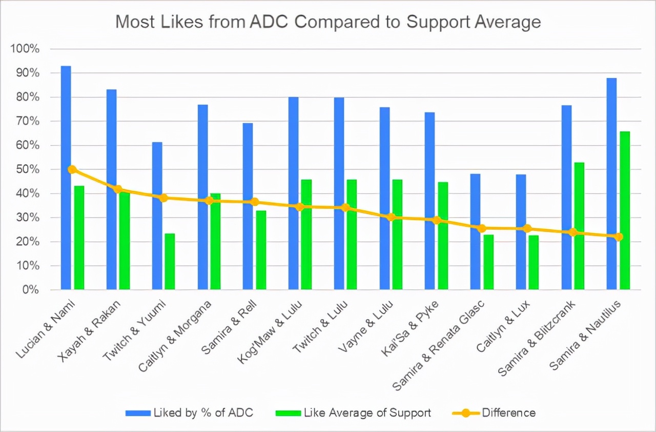 这里提供另一些参考数据,首先是每个ADC英雄最喜欢的5个辅助和最讨厌的5个辅助。