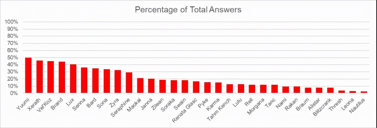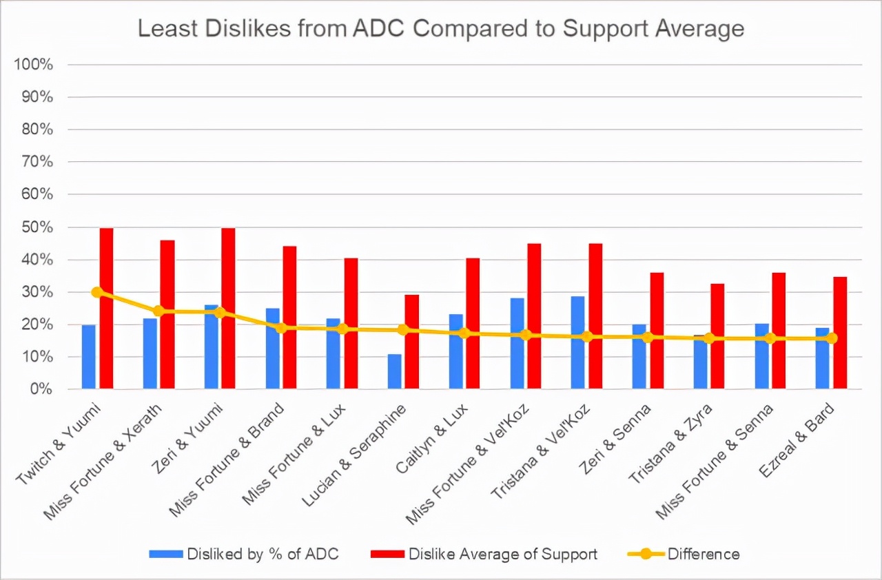 这里是最不被讨厌的辅助英雄,与平均讨厌程度的对比结果。只有20%不到的图奇玩家讨厌悠米,25%左右的泽丽玩家讨厌悠米。