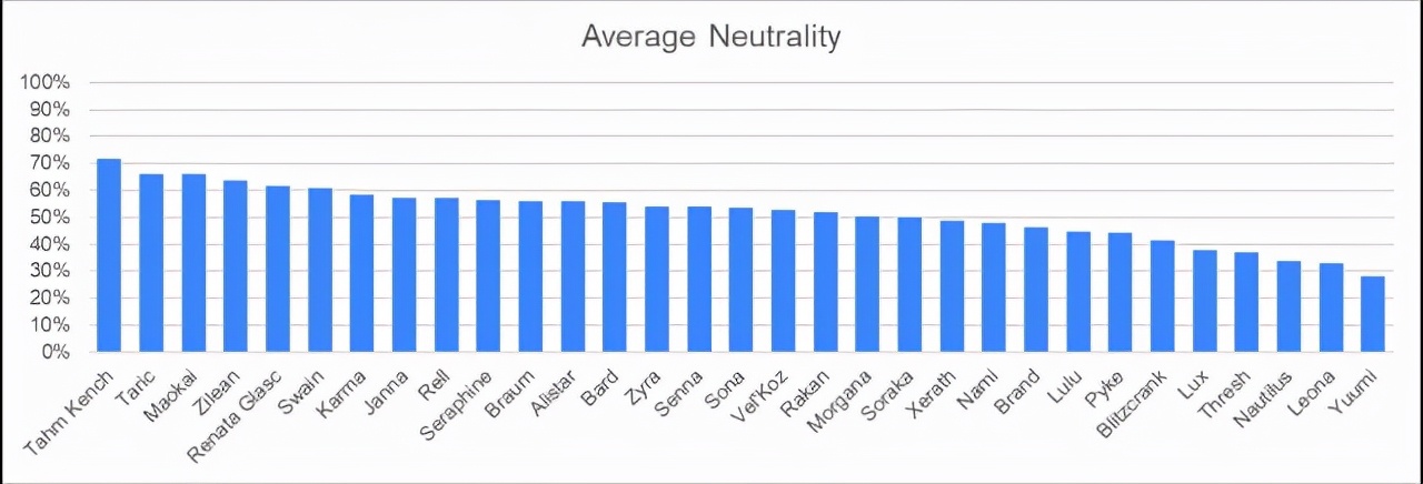 还有一个比较独特的投票结果,就是那些最不被喜欢也不被讨厌的辅助英雄,塔姆、塔里克、茂凯、基兰和烈娜塔排名前五,这些英雄在特定的阵容里表现不错,ADC玩家对他们的喜爱和讨厌程度一般。