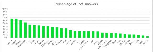 我们可以看到蕾欧娜排名第一,诺提勒斯只落后一票跟随其后。维克兹倒数第一,泽拉斯则是倒数第二。开团型的辅助英雄普遍受到大家的喜爱,法系辅助英雄则没有受到青睐。软辅英雄的数据最复杂,有璐璐和娜美这种热门英雄,也有娑娜和萨勒芬妮这种靠后排名。