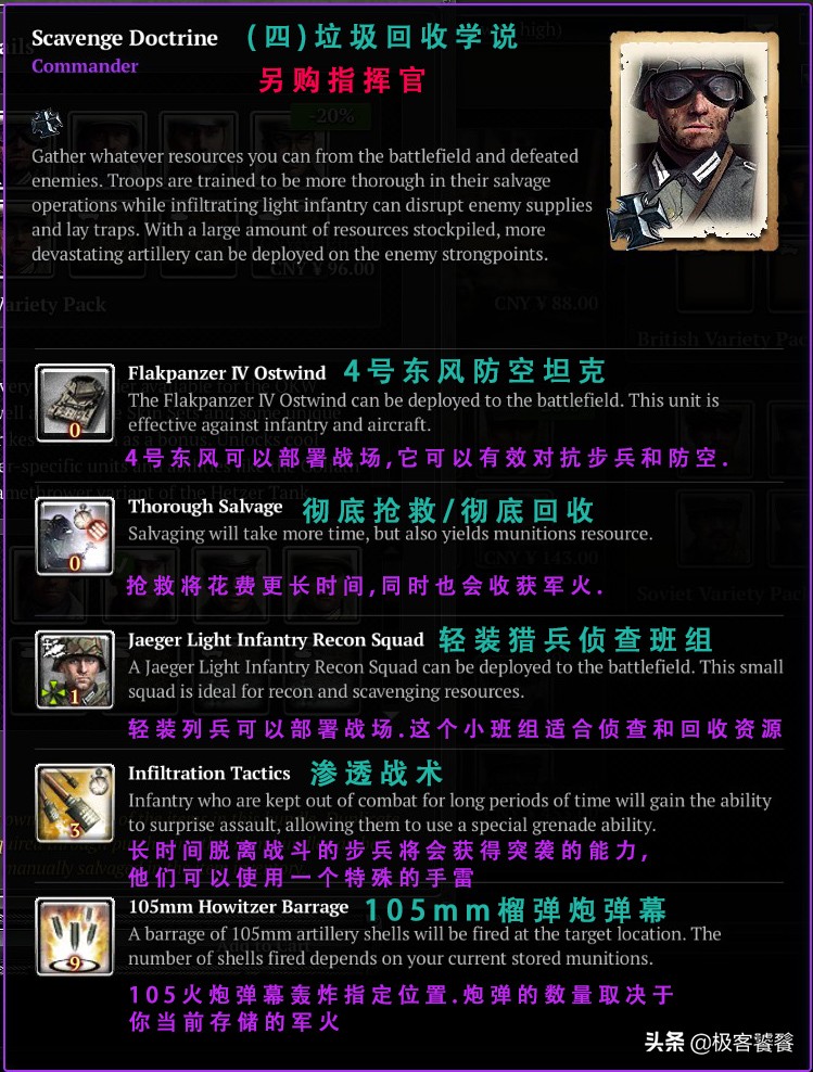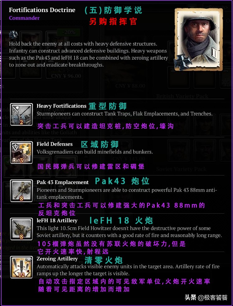当然里面有5个部队可以选择:东德,西德,英军,美军,苏联.相信有很多人喜欢玩西德(黑科技).那么本期我就来简单从英文字面上介绍下里面的指挥官.(本人里面的指挥官也没有买全,平时不打折的价格太贵.促销期间的价格有时是正常价的六分之一,就是平常买一个指挥官的价格,活动的时候可以买6个).感兴趣的朋友可以关注下steam的活动信息,当然我也会第一时间告知大家.