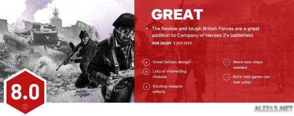 《英雄连2:英国部队》是一款优秀的独立扩展包,它可以让玩家感受到一个真实的二战英军部队。游戏拥有很多有趣的选项,专属英军的武器出现在游戏的战场上,让玩家眼前一亮。虽然游戏在平衡性方面还存在少许问题,但瑕不掩瑜,这款独立扩展包非常值得一试。IGN给出了8.0分。
