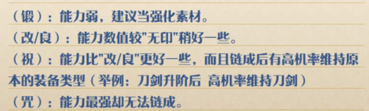 装备除了稀有度的区别以外,还会有词缀的区别,分别是:无词缀、锻、改/良、祝、咒。每种词缀都有自己的含义。这里咒是一个比较特殊的词缀,因为咒虽然是高属性,但同时无法进行锻造升阶了。所以在后期,如果刷到了橙色的咒系列武器的话,那就是可以当做毕业武器来用了!