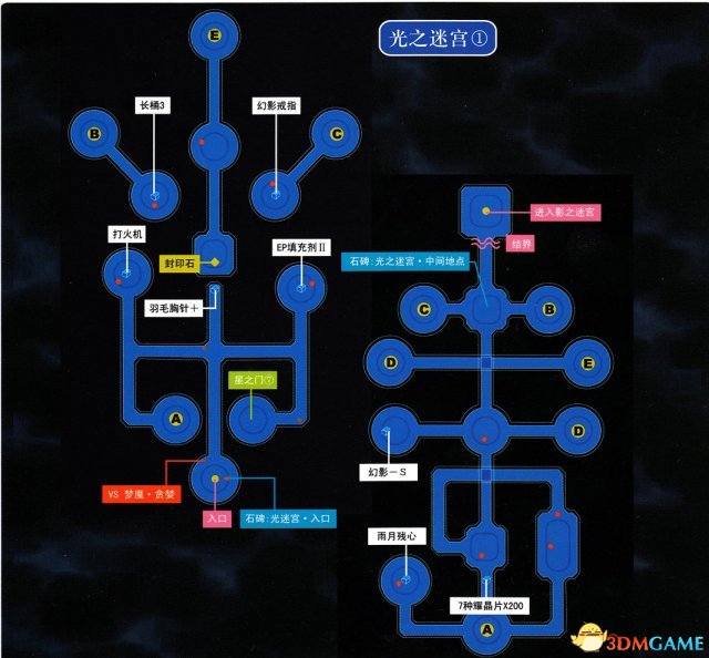 按照图中A-B-C-D-E的顺序走,注意收集沿途的宝箱和调查星门13、太阳之门⑤,到了C点先去救基尔巴特拿到最新的安全卡片之后再前往机库。