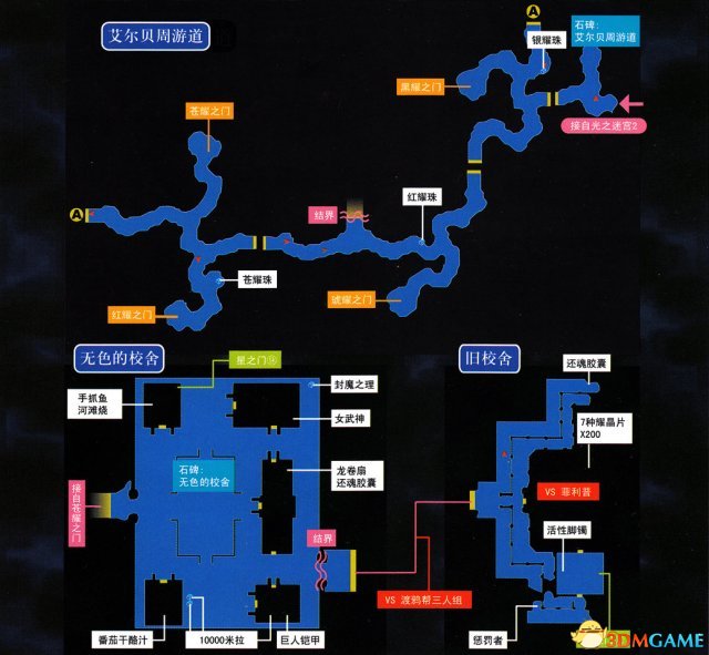 建议先把A-B这个支路走完,拿全宝箱并调查太阳之门①(现在进不去)。回来之后走C-D-E-F这条支线,进入埃尔赛尤号,在埃尔赛尤号底层机关室的卡佩尔上面可以将船内的三处上锁的门全部解锁,现在调查整个船并拿全宝箱,注意甲板上的和作战室内的,很容易漏掉。