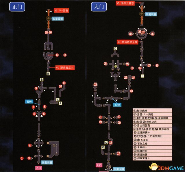 大门的敌人实力最强。中BOSS跟左门的一样,会即死攻击,注意防御。走到回复点并做好最后的调整之后前进到大门处,剧情选择“打开门”就会开始最后的BOSS战,注意此后的连战将不能中途调整装备,所以最好先存一下档再继续剧情。BOSS战是四连战,将由四个门的队伍分别击败四个BOSS之后才能通关。