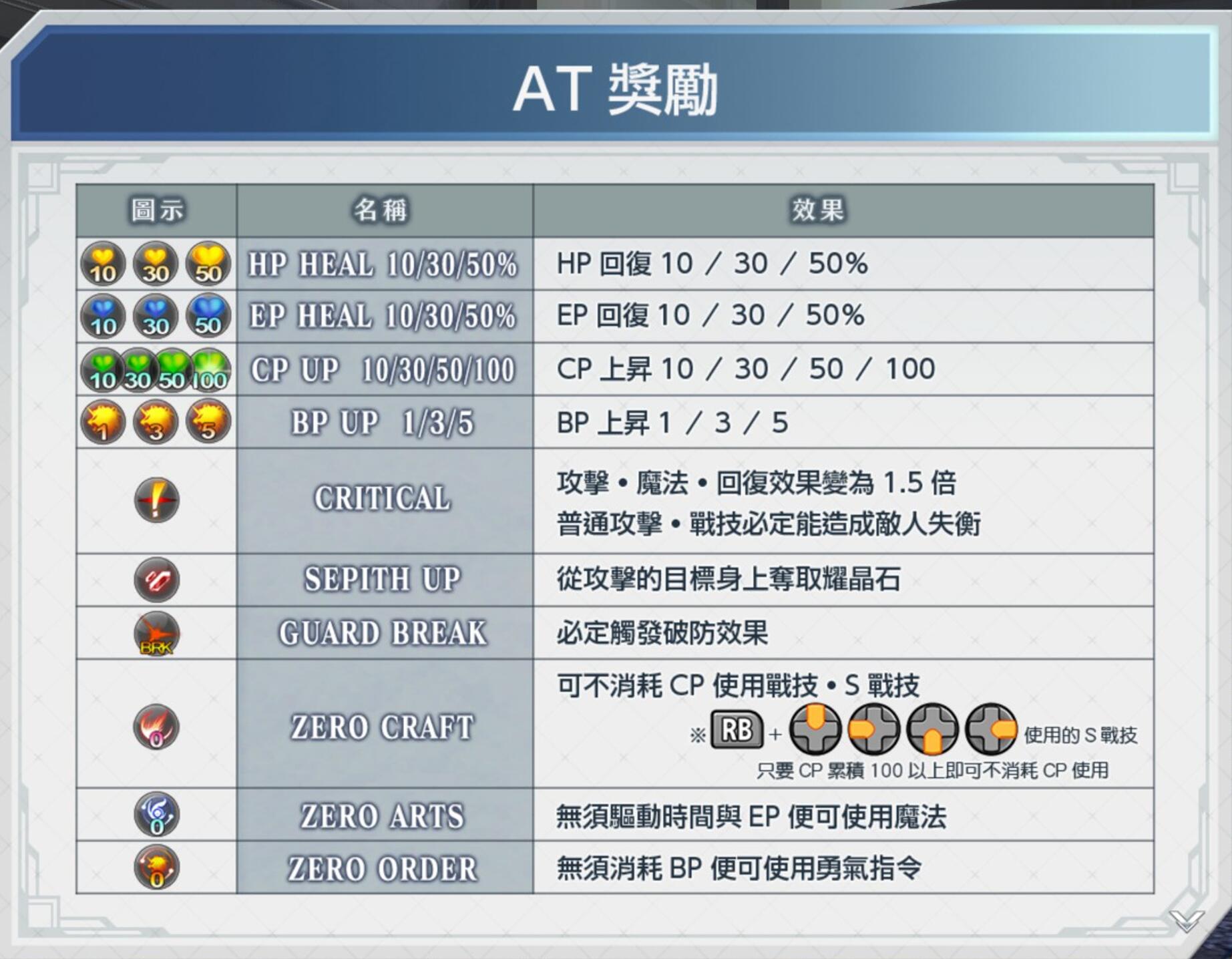 围绕着各类资源和资源转换,在回合因素上,通过各种AT效果(比如BP/CP/EP的零消耗)进一步增加了战斗的随机性乐趣,那么如果运气不好优势AT效果是敌方怎么处理呢?可以通过0延迟的技能(比如罗伊德燃烧之心)拖回合,此外所有队员的S战技都是可以无视回合顺序强制触发的,但是也会陷入超长时间的延迟,建议尤其是BOSS战BOSS发怒时慎重使用。