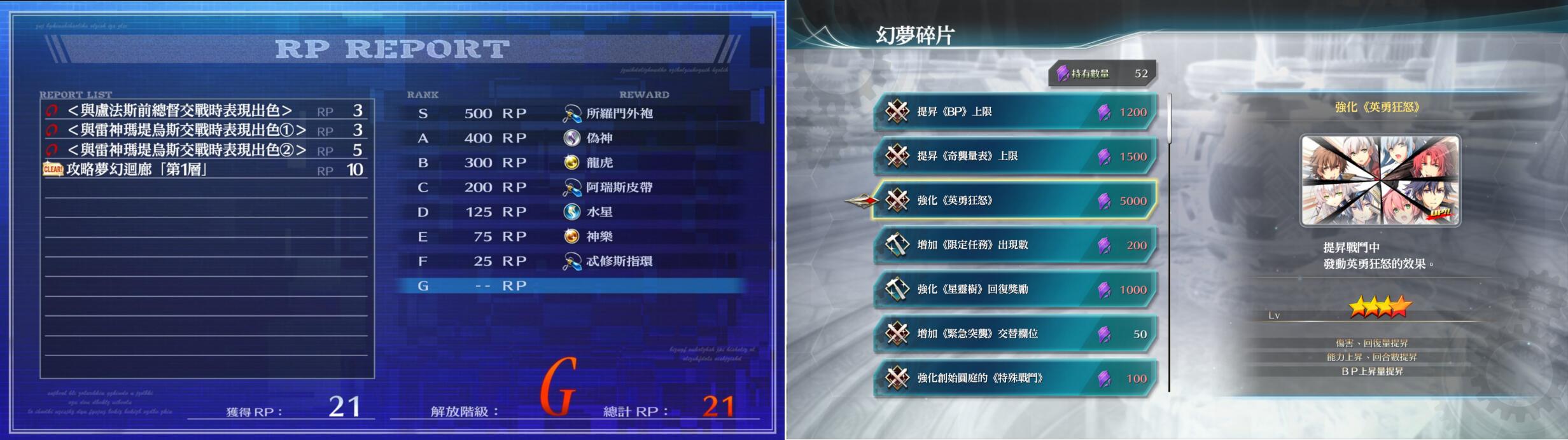 在梦幻回廊中,除了现实世界也有的各种商店的功能plus版(各异兑换各种珍品),还有就是可以用SR点数(可以看做成就点数,比如多少回合类击杀某BOSS)和梦幻碎片(完成主要任务、限定任务获得)来兑换各种强力道具和效果——比如可以让回廊类的银之树回满队伍的所有资源、可以把BP上限增加到8点、奇袭点数增加到4点等,此外最强的装备和核心都在SR兑换里。