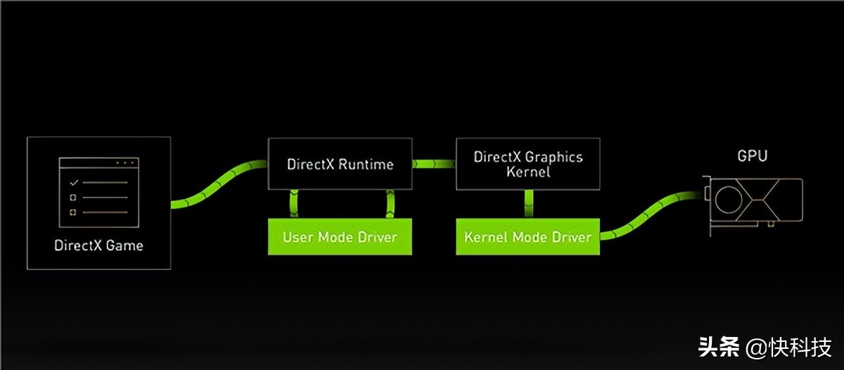 简单来说,游戏从软件到GPU的过程有四个环节,一个是DirectX Game,中间的是用户层驱动、内核层驱动,最后到GPU,这里面每个环节都有可能导致游戏性能表现不佳,NVIDIA Game Ready驱动的游戏优化与之息息相关。