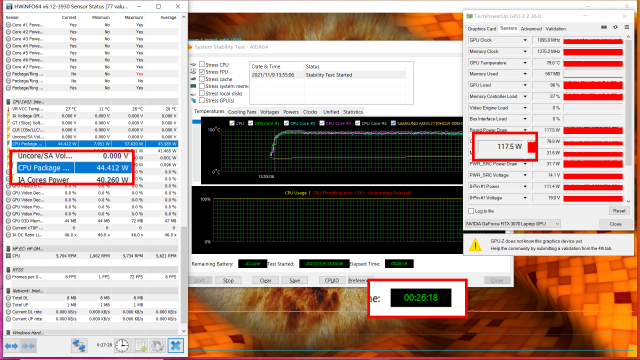 我们使用AIDA64FPU+Furmark进行双烤,烤机时长近半小时,处理器与显卡的功耗平衡在约45W+115W。
