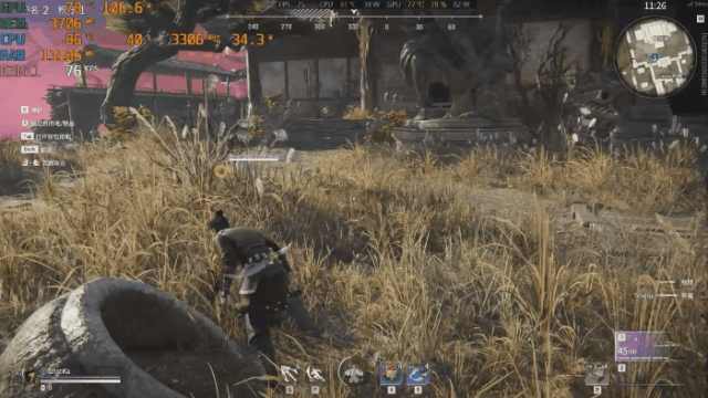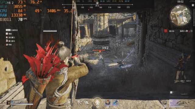 在远处通过弓箭攻击敌人,帧数能保持在70帧+,此时GPU功耗在77W左右。
