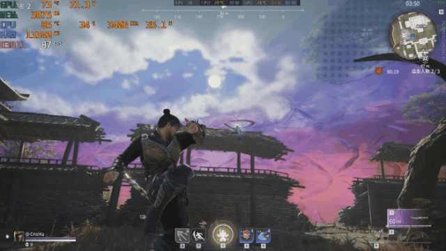在地图场景奔跑跳跃、飞檐走壁,可以达到80帧+,GPU功耗可以达到95W。