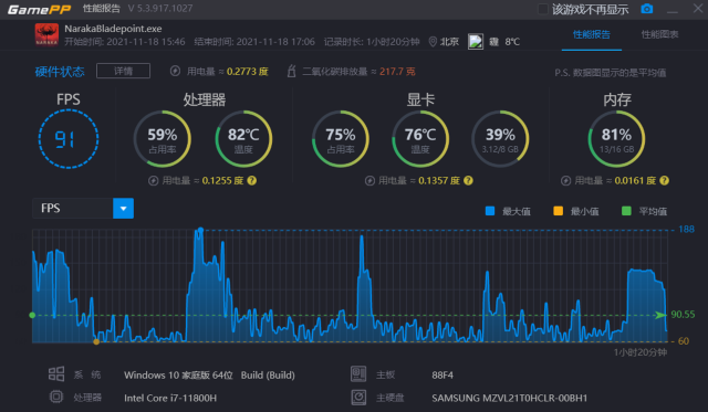 我们通过第三方软件记录了在玩游戏时候的帧数,可以看到其最高帧数188,最低帧数60,平均帧数能够达到90.55帧,非常流畅。显卡的平均占用率为75%,CPU的占用率为59%,内存的占用率为81%。