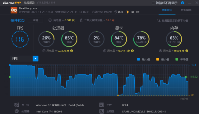 简单进行体验来看,游戏最高帧数为134帧,最低帧数88帧,平局帧数116帧,表现非常出色。