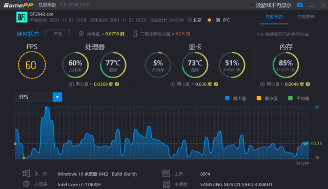 一盘下来我们可以看到其最高帧数能够达到96帧,最低帧数46帧,平均帧数60帧,基本是可以畅玩这个游戏的。另外,希望游戏方早日清除bug吧!