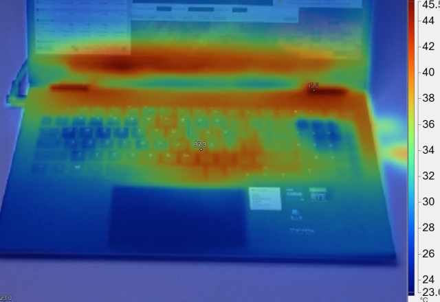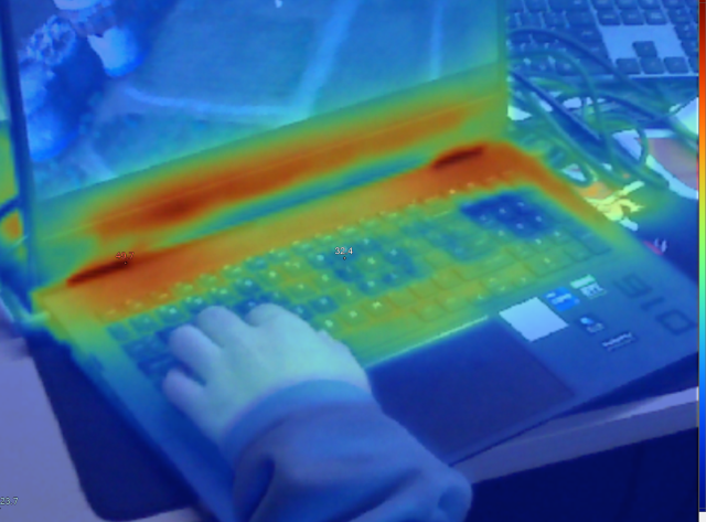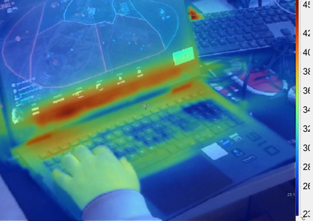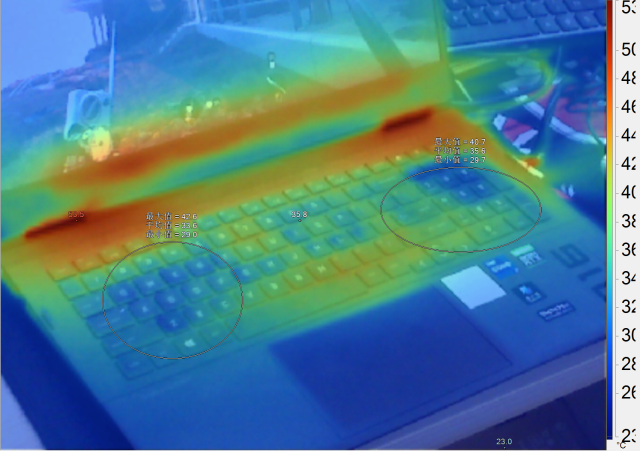 在游戏过程中,我们也通过热力仪对笔记本的散热表现做了一个记录,可以看到,常用键位基本低于手指的温度,表现非常不错。