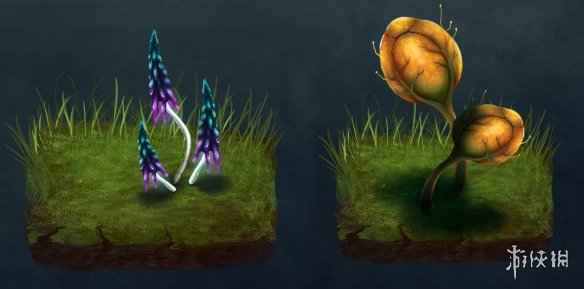 最后官方展示了两种新的真菌,除了青青草原上的普通红色蘑菇和黑暗林山中的发光黄色蘑菇之外,在迷雾之地中将会出戏新的变种蘑菇可用于烹饪。图中可以看出它们是紫色和黄色的蘑菇,可能也可以用来制作紫色染料。