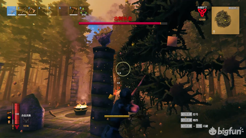 攻略这个BOSS细木弓是必须的,并且请尽量提高细木弓的等级。老树弱火,火箭可以打出不错的输出并且有dot伤害。此外,如果选择不使用近战武器只用弓进行攻略也是可以的,但是要准备两把细木弓,一把的耐久不够。
