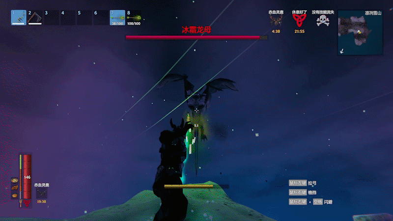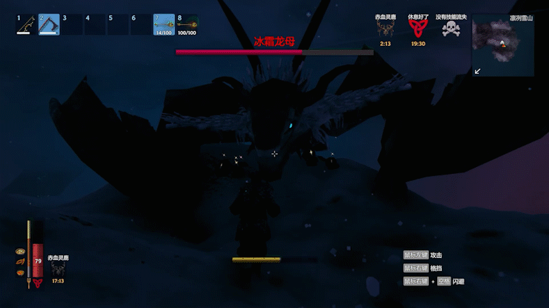 会上天下地的BOSS,设定其实应该是蛮有意思的,但是由于雪山地形高度差过大,以及BOSS的体积碰撞过于奇怪,会导致很多BUG,比如BOSS落在半山腰会卡住动不了直接白给半天然后飞天;BOSS在地面时与人物太过靠近会卡模型,人物卡在BOSS肚子上走不出来,BOSS模型也在原地抽搐……虽然不难打,但是BOSS战的体验着实不太流畅。