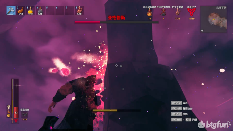 药品方面抗火大麦酒是必须的,有一瓶就够,10分钟的持续时间。回复药耐力药和蜜酒是硬莽时候用的,注意回复药和蜜酒别一起用。