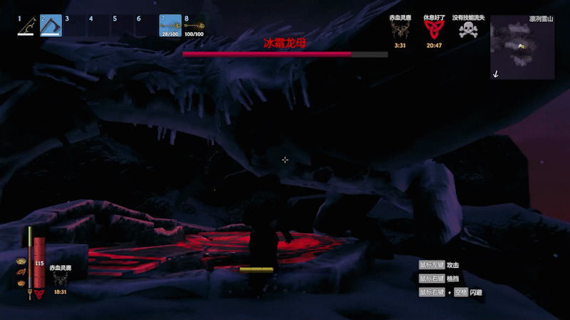 目前能够找到的攻略要么是利用高低差逃课,要么是用拒马扎BOSS实现远程输出,要么就是寒冰箭。单人锤子能不能打过?能打,你需要在瞎眼的特效中看到BOSS的普攻并且一个不漏地滚掉,半血以上就莽,半血以下就拖血药CD,肯定能打过,但是根本不能称作处理,没有教学意义,所以下面仅介绍技能,不讲解任何招式处理,因为处理不了。