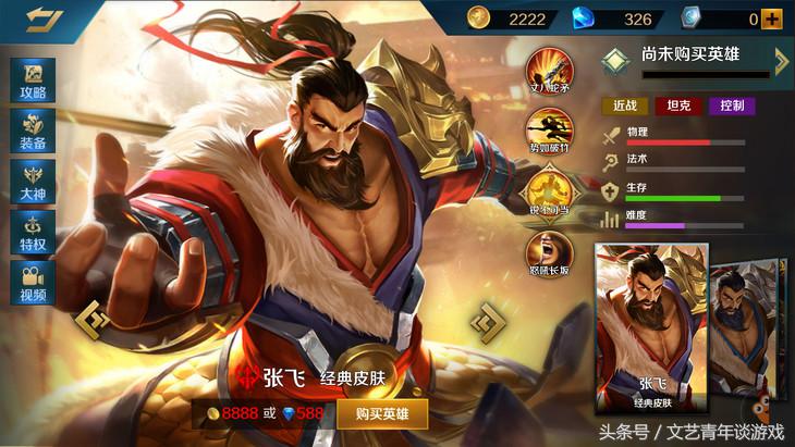 张飞号称打不死的坦克,大战开着等于是无敌状态,还会把所受到的伤害化为血量,和关羽一样,是团战中的搅屎棍(不愧是兄弟啊),你不打他也不是,打他也不是,而且还有着控制技能。