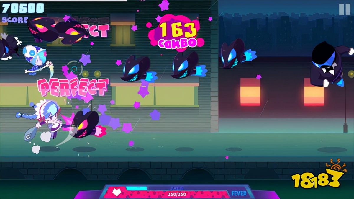 游戏整体的玩法大概是这样的,我们需要通过对空中和地面的怪物攻击来完成对应的节奏,基础操作非常简单,我基本上只要用到两个手指,虽然换成了键盘但短按和长按的操作还是一样的,如果你是一个音游萌新,那么完全可以对游戏的开局放下心来,几乎都把它当成纯粹的跑酷来耍。