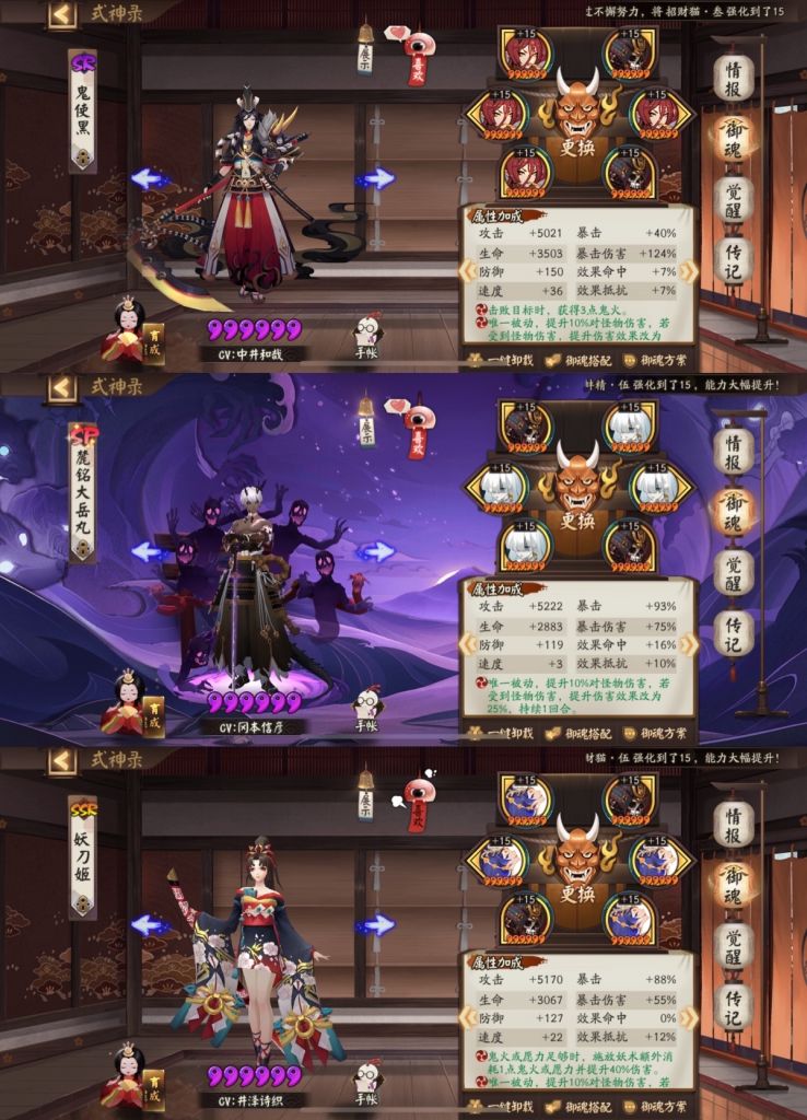 妖刀需要一套暴击的海荒套;鬼使黑则需要一套一半暴击的阴摩罗荒骷髅;麓丸需要一套暴击的狂荒套。