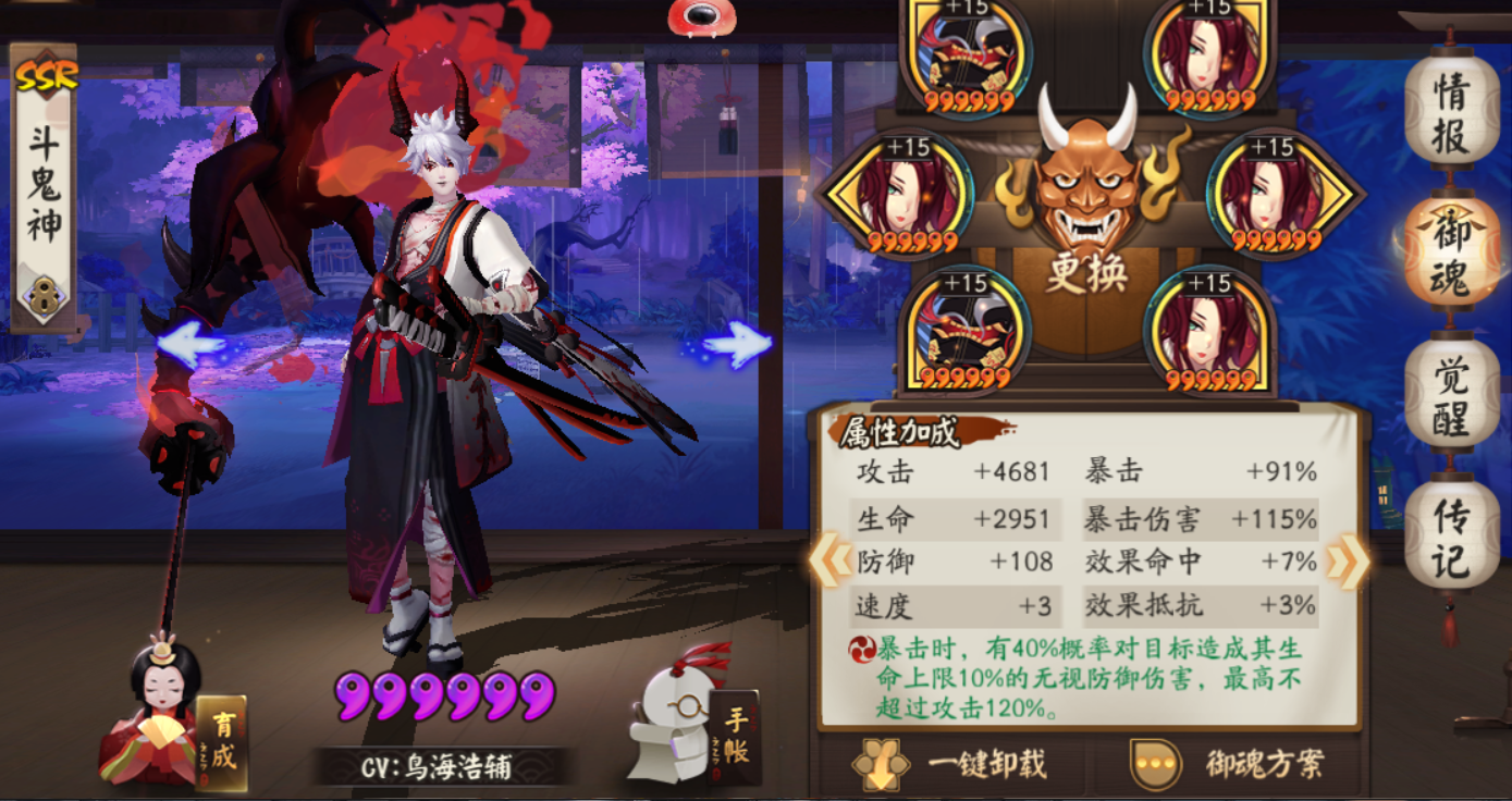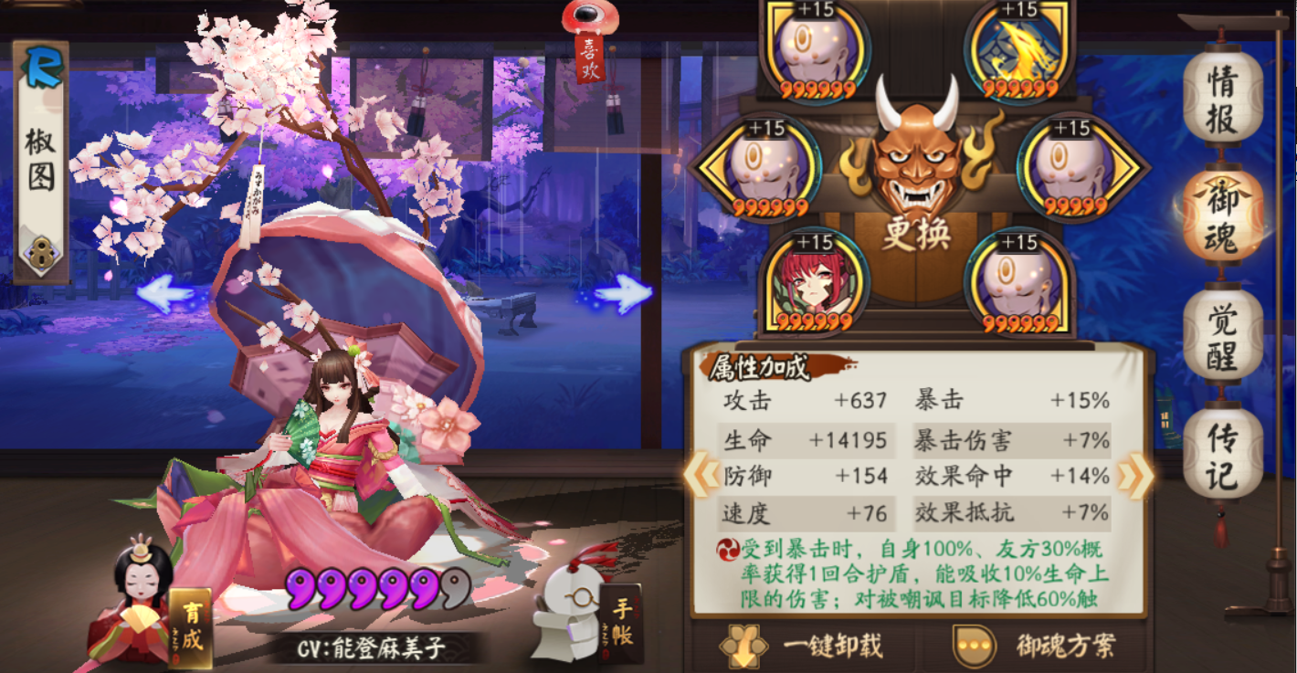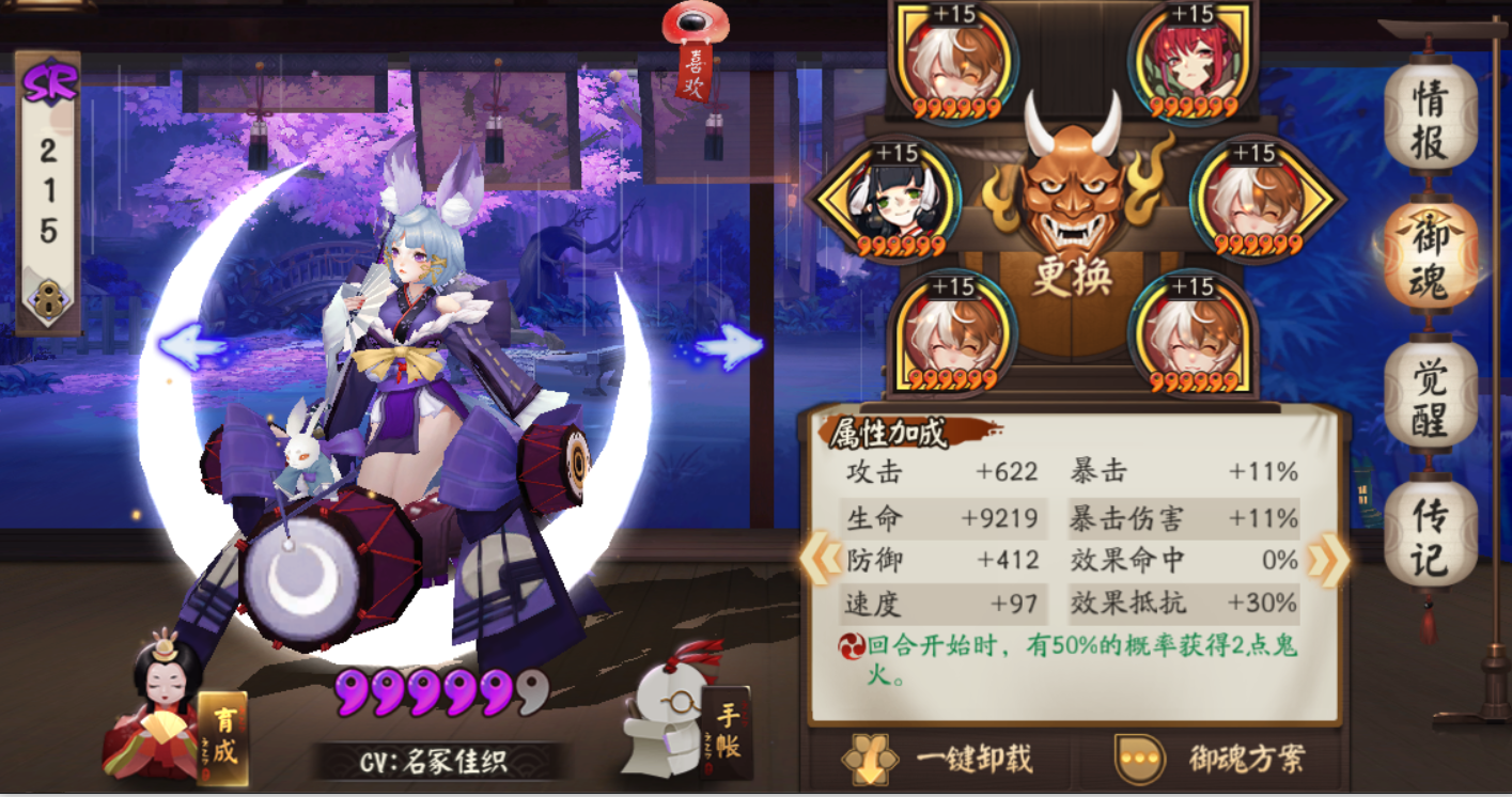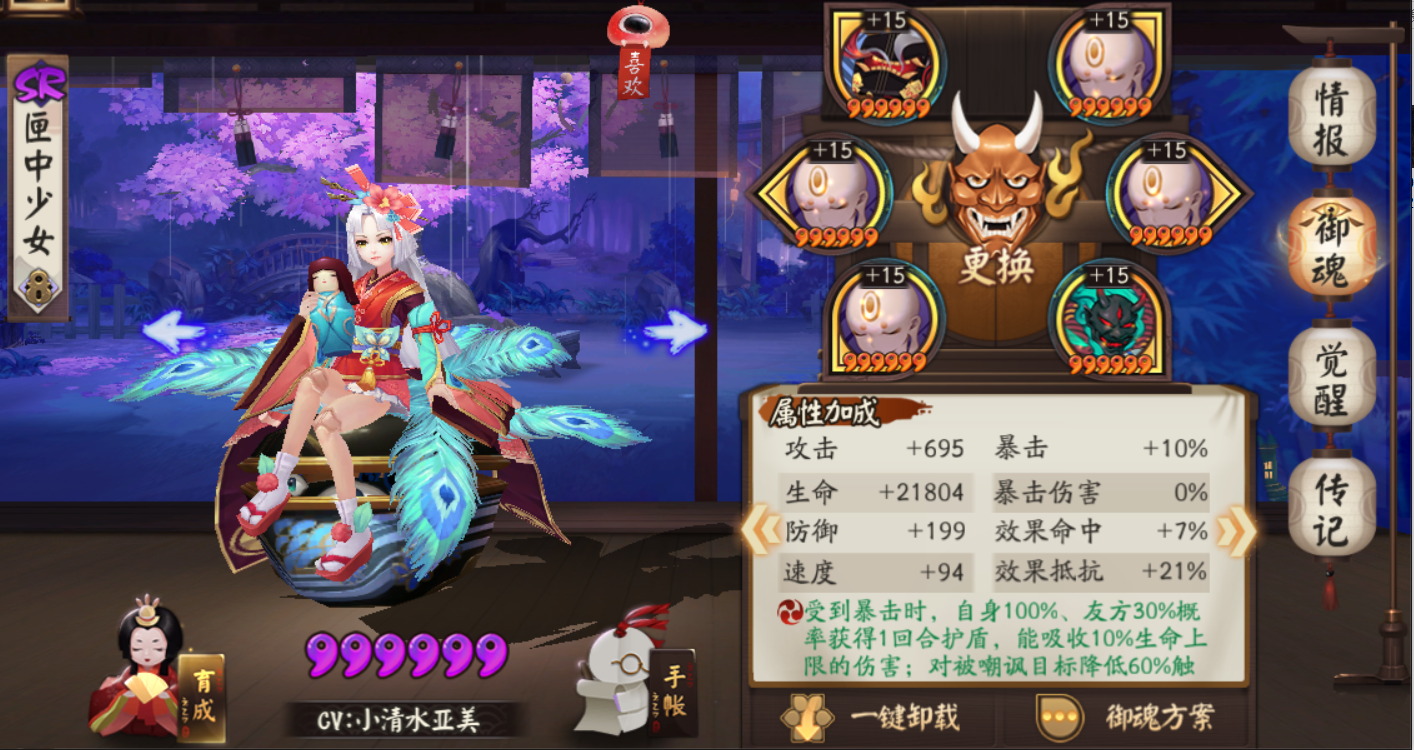 最后压轴的就是辉夜姬小公主啦~打火机里的战斗机。御魂带蚌精四件套+暴击两件套即可。大佬们可以考虑提一提爆伤,越高越好。可参考配图。
