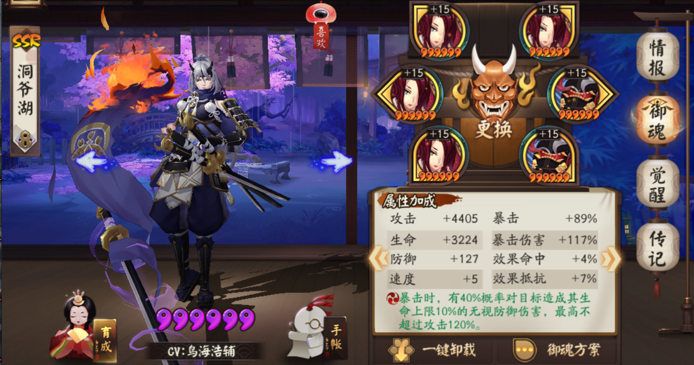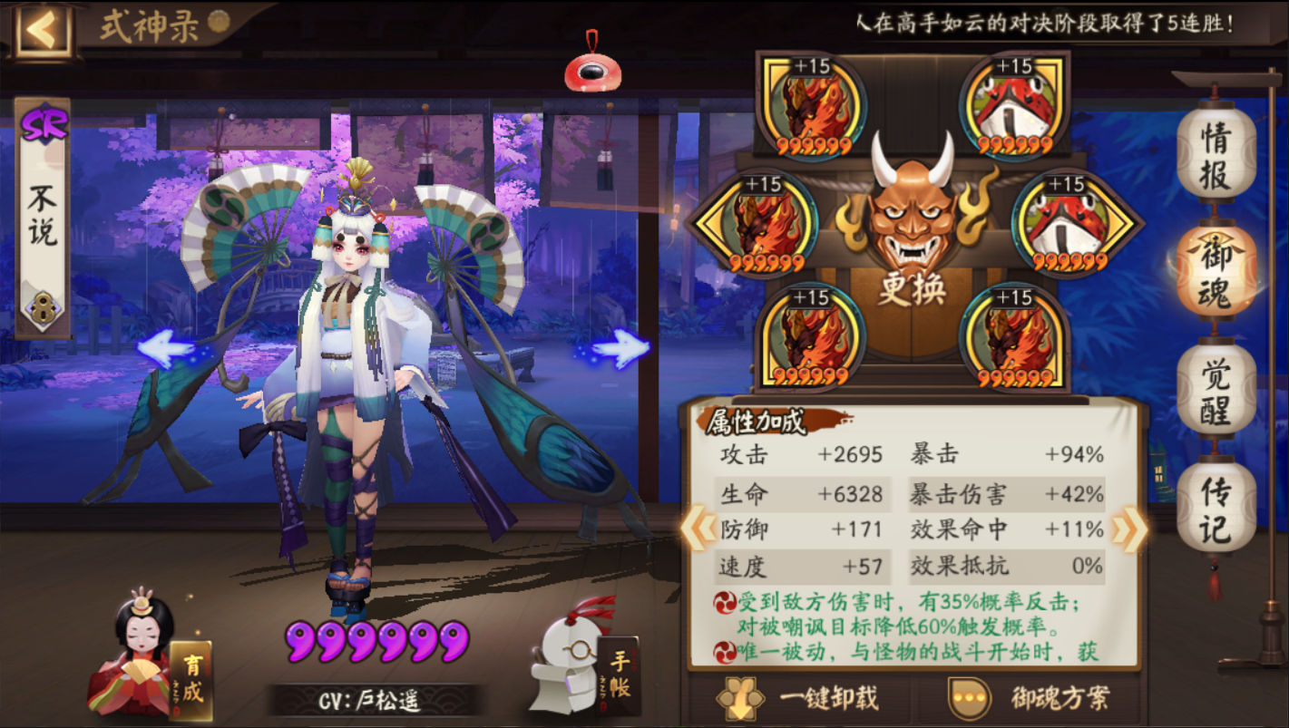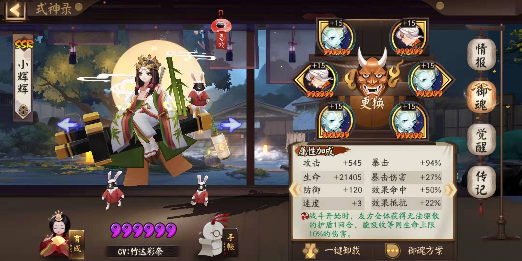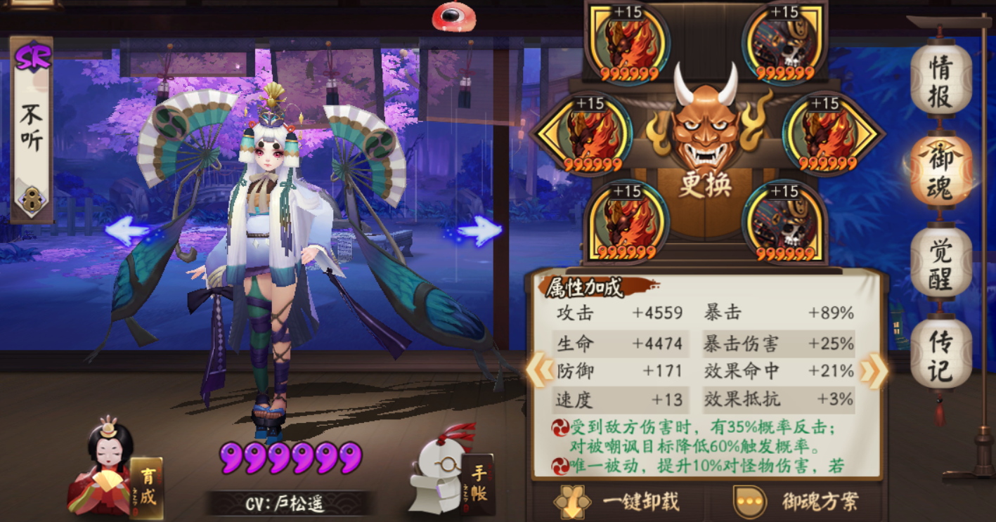 最后压轴的就是辉夜姬小公主啦~打火机里的战斗机。御魂带蚌精四件套+暴击两件套即可。大佬们可以考虑提一提爆伤,越高越好。可参考配图。
