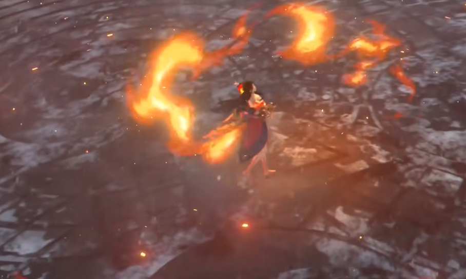漫步在平台上翩翩起舞,挥手的过程中,烧起一片火焰尾,旋转舞动的姿势不断加快,最后定格,先给了一个背部的特写,然后转头定格画面。