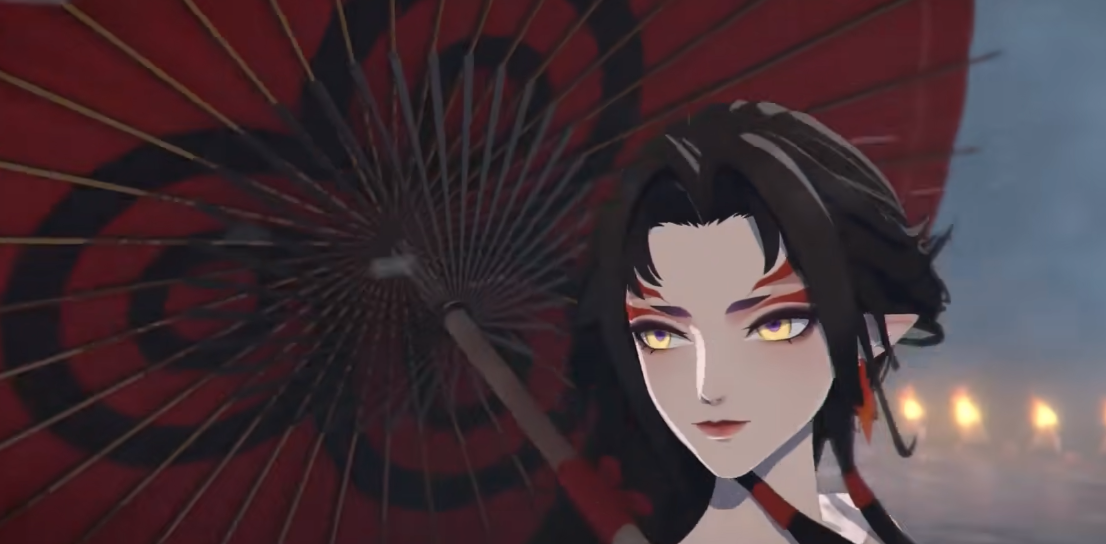 而随着火焰烧起来的画面逐渐模糊,一个完美的转场,变成了手持花伞的的画面,而镜头的扭转再次显现出伞下绝美的铃彦姬。