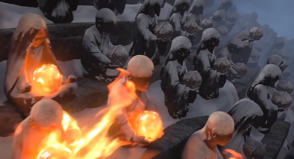先说一开始的大场景,摆满了石像雕像的山,一大片一大片的环绕你,手上的球体开始点燃火焰,一传十,十传百,画面旋转速度越来越快,整个山都陷入了一片火海中。
