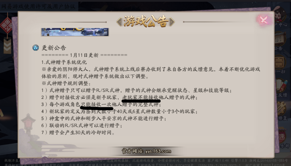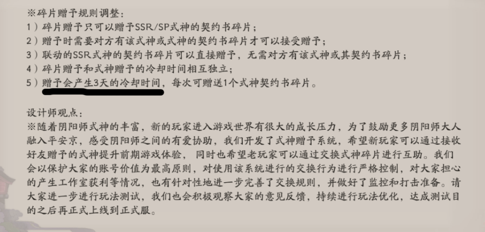 对于完整式神的赠予,一个账号这辈子只能给一只,封堵了所有工作室见缝插针的可能性。且给了完整式神有30天的冷却时间,之后再给只能给碎片了。不过值得庆幸的是联动R/SR式神可以给完整的,看来目前该游戏唯一的商机就是大量的蜜桃了。(然而老玩家依旧拿不到,所以真正占便宜的是新服玩家)