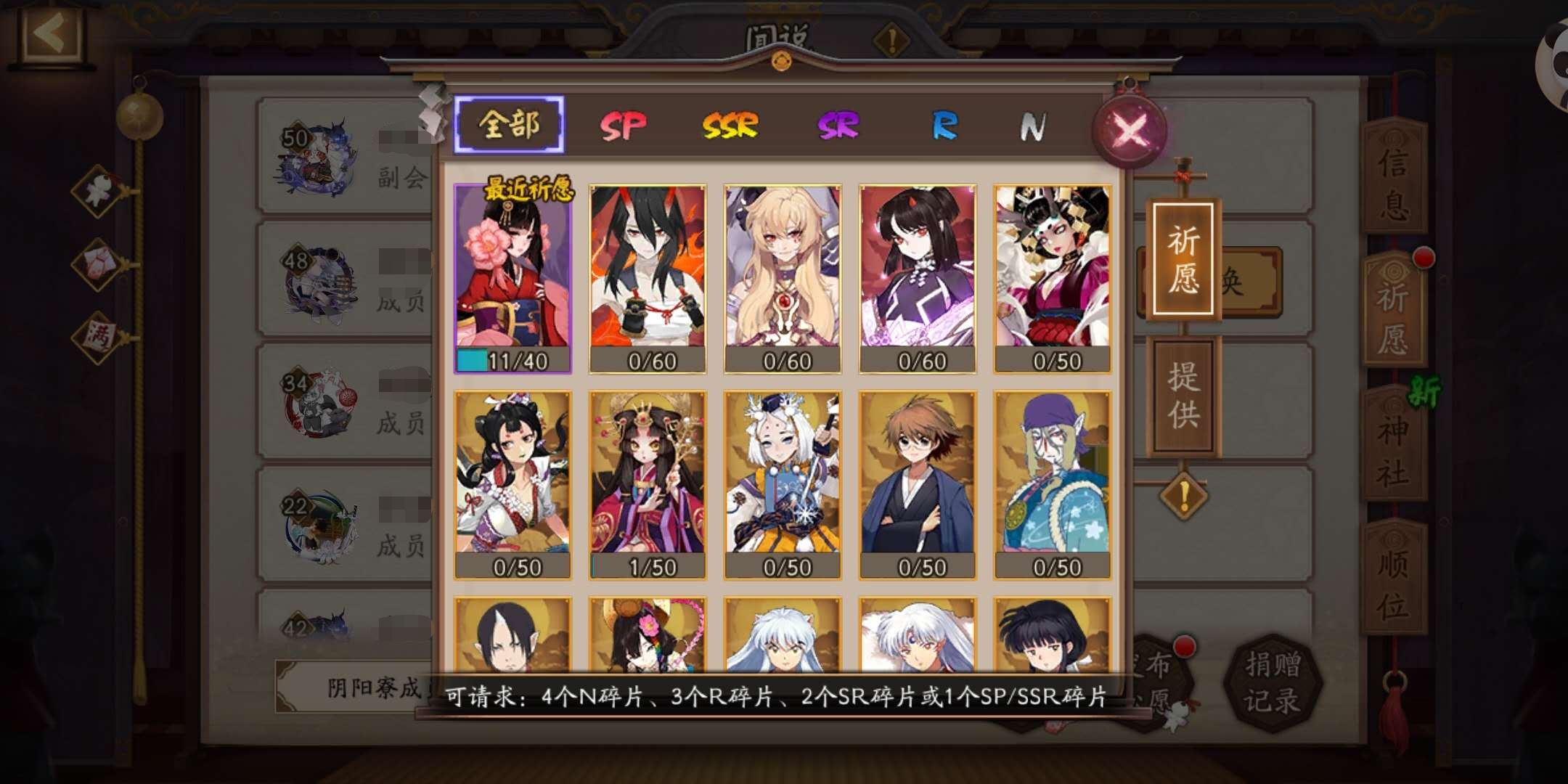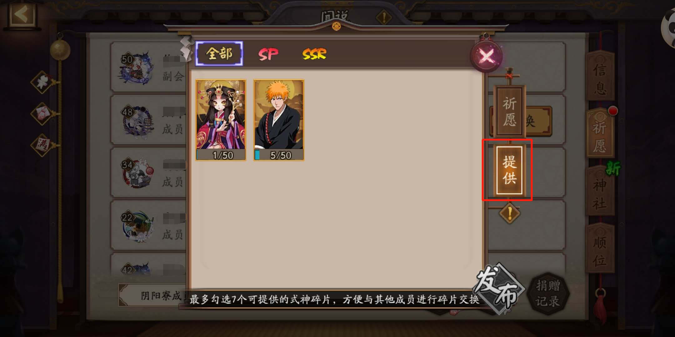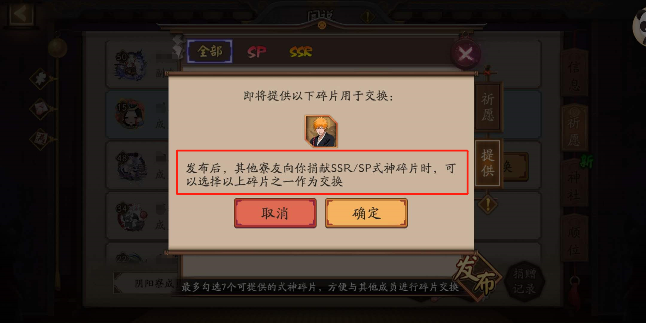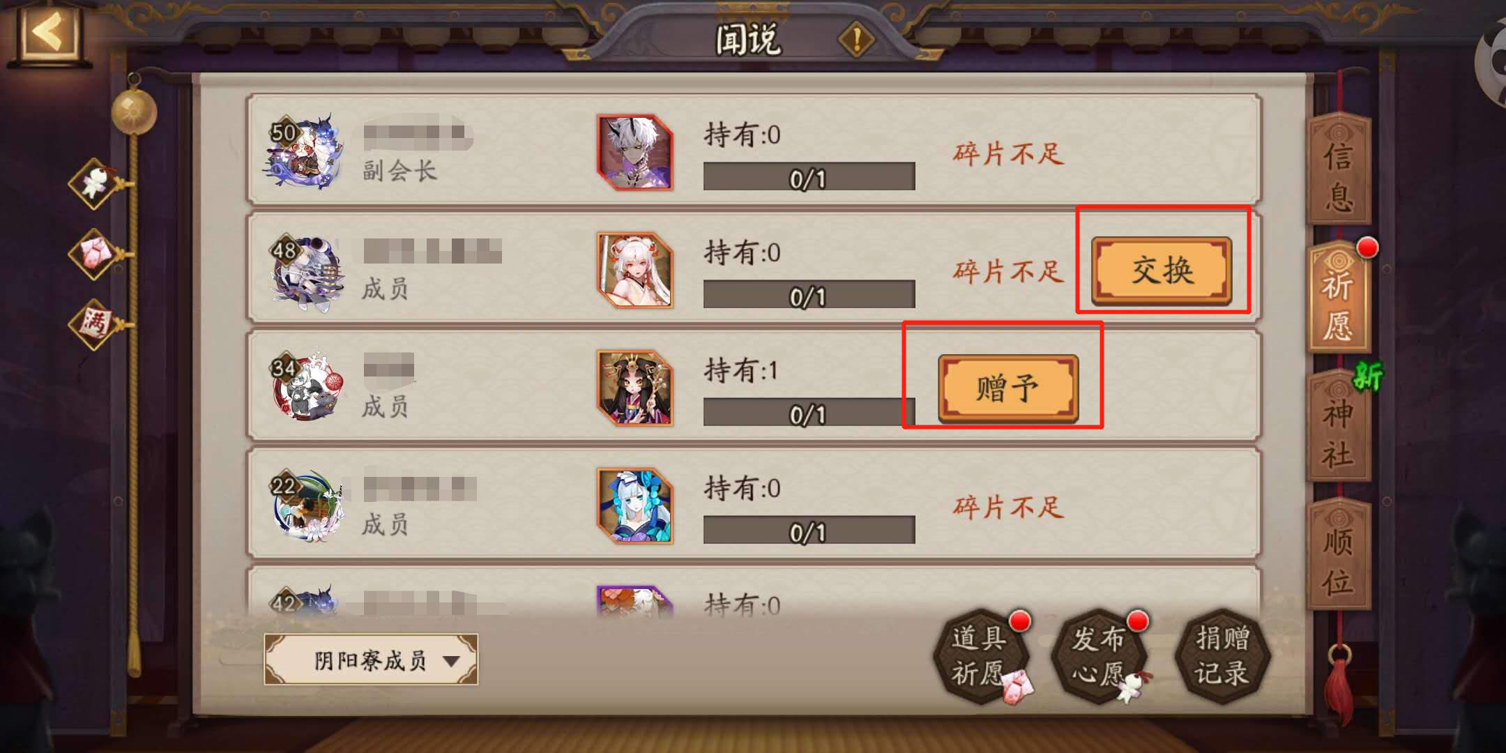 这个交换碎片仅供SP和SSR稀有度的式神使用,其他稀有度式神不可以使用。在"祈愿"界面里面,有选定了"提供"碎片的玩家,祈愿的消息后面跟的是"交换",如果没有交换的意图就没有选择"提供",那么祈愿消息后面就是"赠予"。如果你使用了交换得到了一片稀有式神的碎片,那么这一天在祈愿界面就不能得到其他人的交换和赠予了,每天的机会还是一样的。