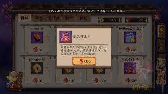 如上图,在阴阳师商店特殊界面的右下角就可以购买到永久勾玉卡,价格是666勾玉。购买永久勾玉卡后每6小时获取5勾玉的收益,存储上限是30勾玉,永久保存。
