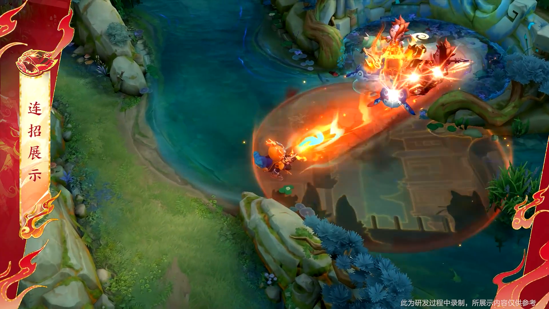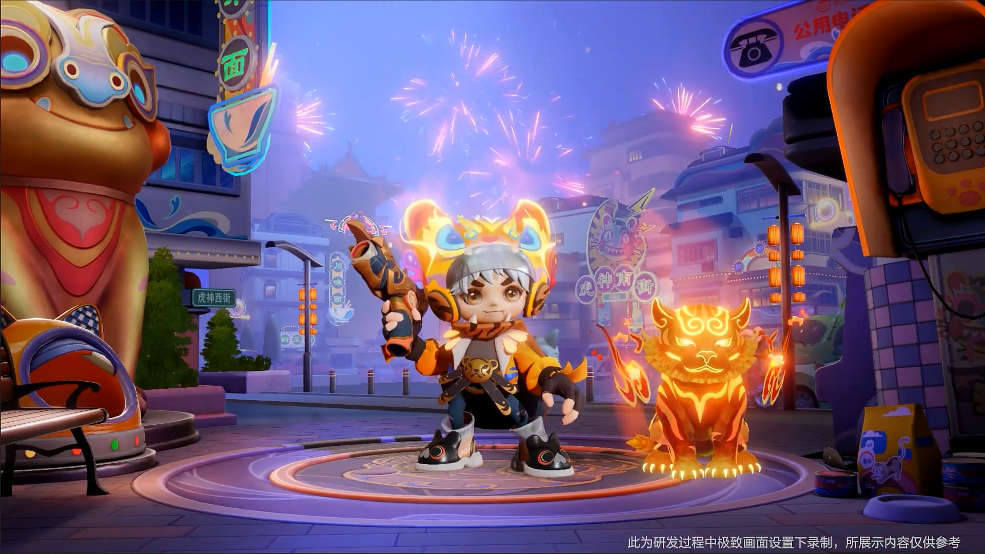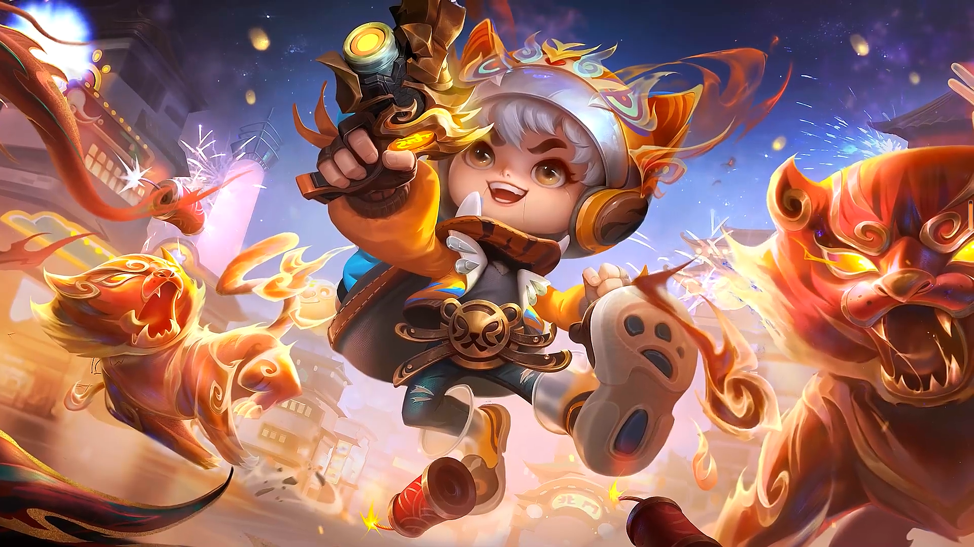 技能展示:特效以焰火为主要元素,技能中融入了小虎神,三个技能均有小虎神的化身,甚是亮眼。