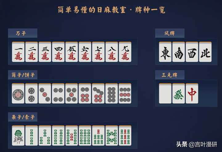 日本麻将牌包括数字、字牌,其中字牌又分为风牌、三元牌。