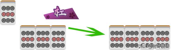 杠:和碰基本同理,碰是1+2,杠是1+3,即手中必须已有一组刻子,才能杠其他玩家的牌。其中,自己摸到的第四张牌叫做暗杠,碰别人打到的牌叫做明杠。