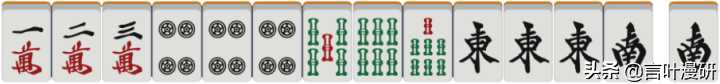 经过一段时间的摸牌、打牌、鸣牌以后,当你手中的牌可以组成4组刻子(或顺子)及1组雀头时,就可以和牌(前提是符合番型)。例如——