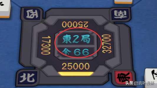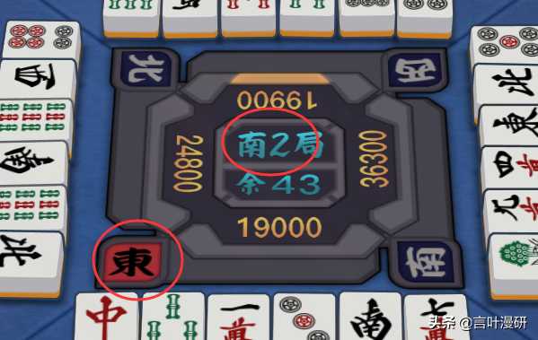牌桌中央的「南」,指该局的场风牌为南风。 左下角画圈处的「东」,指该局你的自风牌为东风