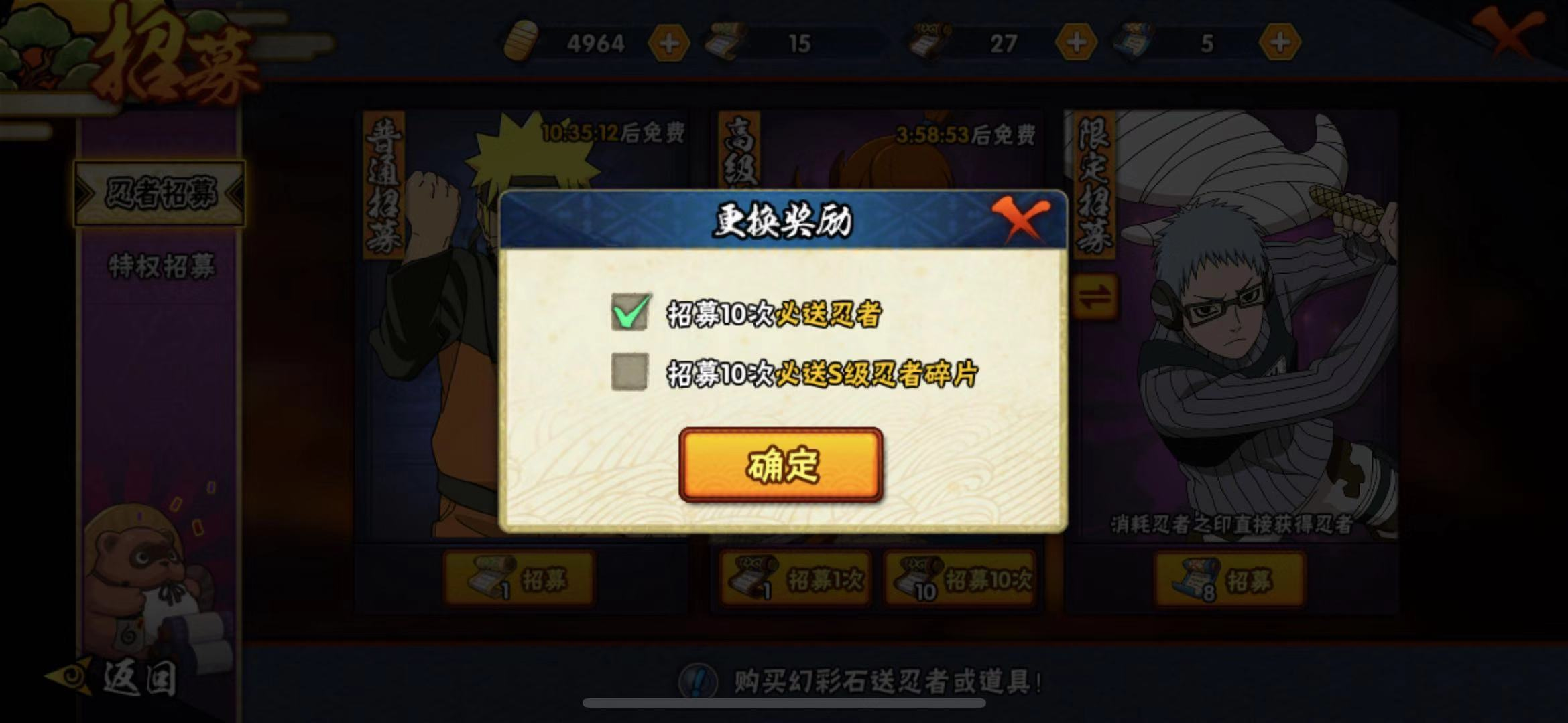 首先,在招募高招忍者前,可以点击高级招募下方的选项设置十连抽保底碎片