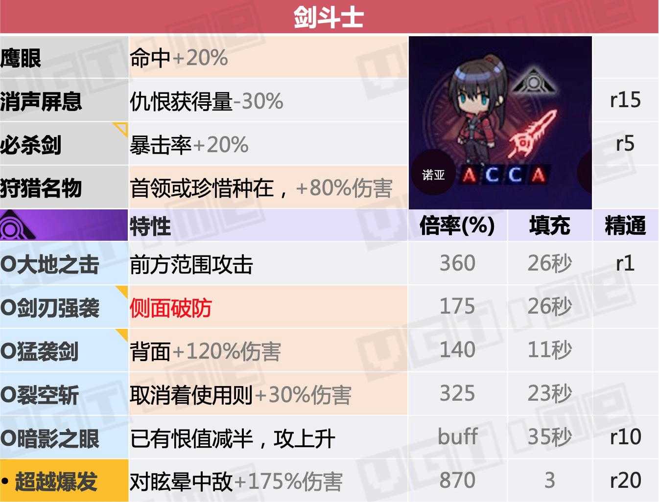 守卫者由于没有直接加天赋槽的技能,故统一不对其进行此类标注。底色为肉色的技能为职业固有技能,无法被精通,是该职业独一无二之所在。「倍率」理解为数值越高就越强即可,如果是群攻战技也会特地说明。