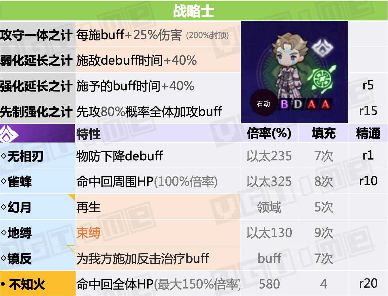 强化我方攻击,弱化敌方防御,高回转率,越给我方上 buff 自己就越强,拥有控敌技,同时以回复力提供保障,游戏中的简介描述其具有高泛用性。