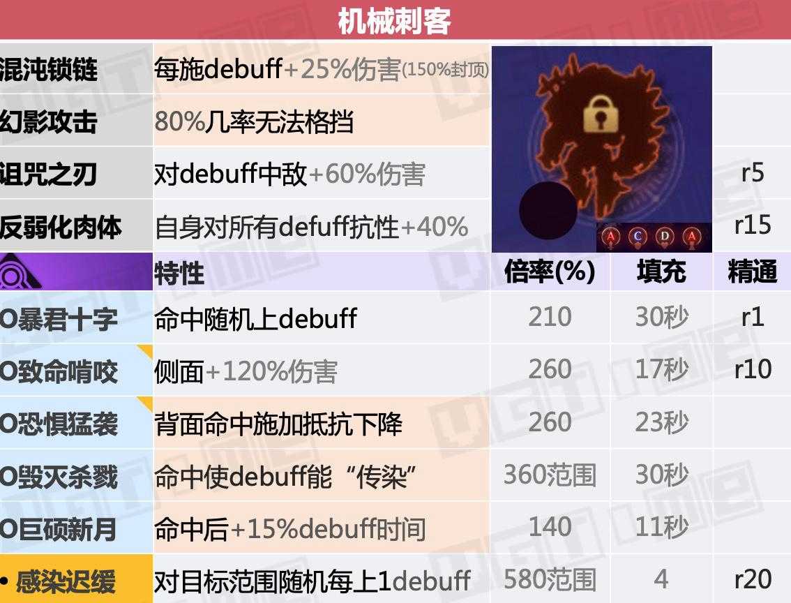 全技能回转率总体而言相当糟糕(既然是随机上 debuff,就有机会轮上很强的),主上 debuff 的技就能需要 30s 的 CD,所以也可配合其他会上 debuff 的队友一起作战会更好(其实基本不用刻意去找)。