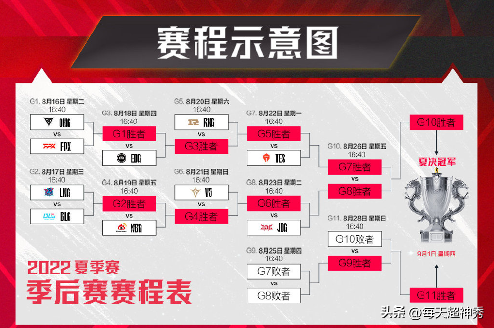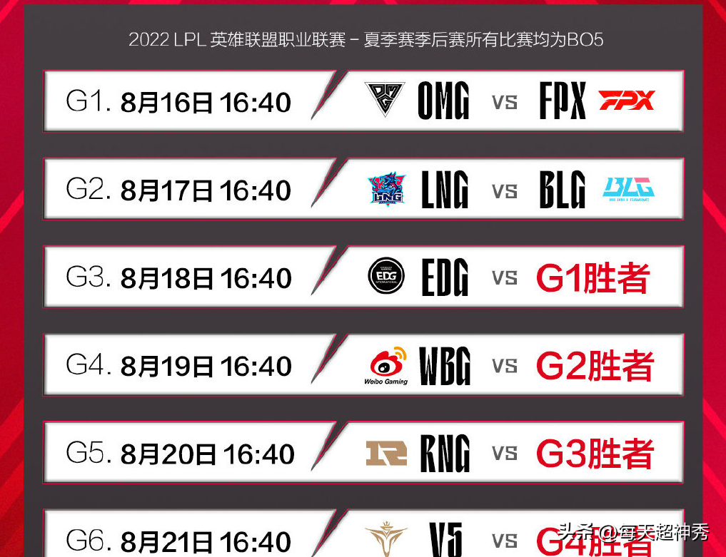 随着RNG收官战落败,LPL季后赛最终赛程出炉,揭幕战在8月16日打响,对阵双方分别是OMG和小凤凰FPX,胜者晋级八强,与EDG正面对决,败者直接淘汰出局;次日LNG对决BLG,胜者和WBG狭路相逢,败者止步季后赛10强。
