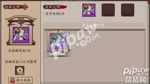 可以设置自己的协战式神供亲友使用,亲友使用后可以积累一定的协战次数,根据协战次数可以获得一定的奖励