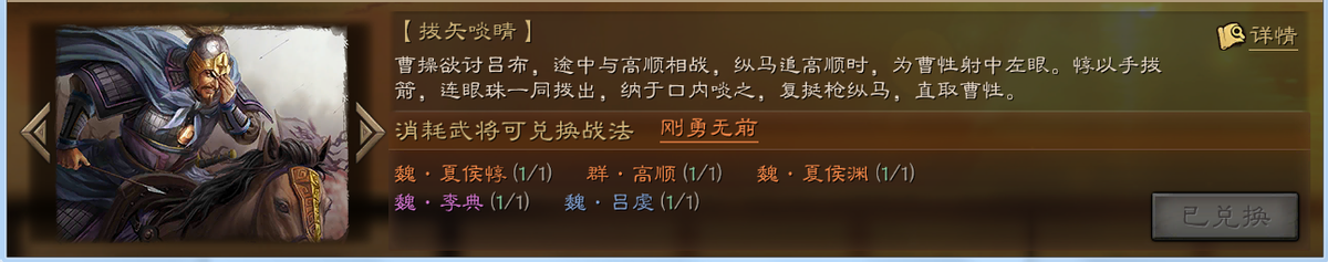 刚勇无前 兑换条件:夏侯惇、高顺、夏侯渊、李典、吕虔